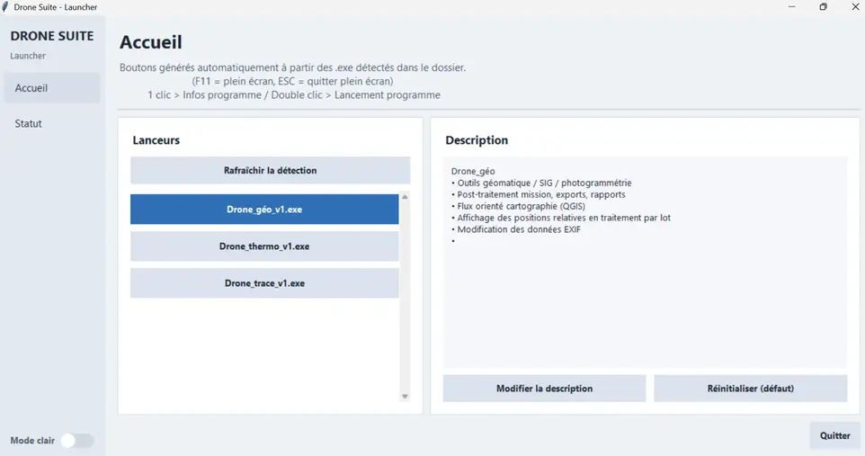 Développement de logiciels en python pour drone Les logiciels Drone software launcher_v1.exe Drone géo v1.exe Drone thermo v1.exe Drone trace v1.exe n'étant pas encore répertoriés dans les bases de données logicielles de Microsoft, ils génèrent au 1er lancement, une alerte Microsoft Défender car ils n'ont pas encore de "signature officielle". No Stress, validez et passez outre l'alerte, je les certifie "Clean's". Je les développé au départ pour mon usage perso... https://kdrive.infomaniak.com/app/share/1421062/13d2ef9d-6ce1-4372-9f08-6967d03ec222 |