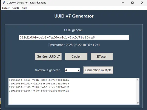 Développement de logiciels en python pour drone Les logiciels Drone software launcher_v1.exe Drone géo v1.exe Drone thermo v1.exe Drone trace v1.exe UUID_generator v1.exe n'étant pas encore répertoriés dans les bases de données logicielles de Microsoft, ils génèrent au 1er lancement, une alerte Microsoft Défender car ils n'ont pas encore de "signature officielle". No Stress, validez et passez outre l'alerte, je les certifie "Clean's". Je les développé au départ pour mon usage perso... |